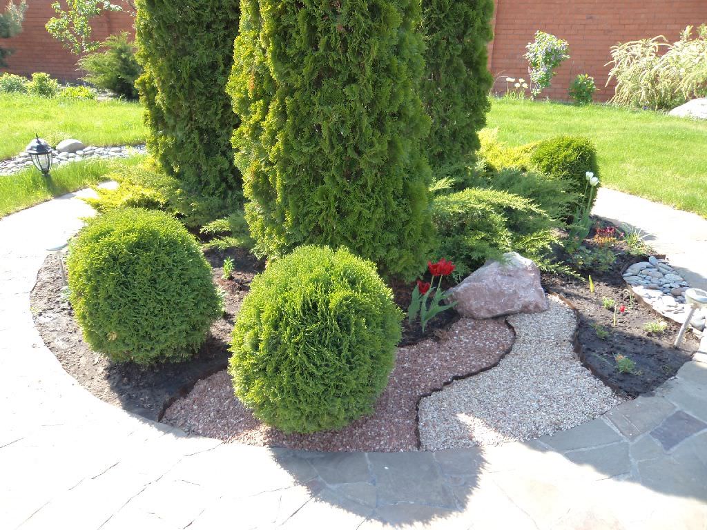 Благодаря своей эффектной форме, шаровидные туи могут использоваться как солитеры – одиночные растения, играющие роль центрального элемента композиции. Они прекрасно смотрятся на фоне газона или в окружении низкорослых цветущих растений.