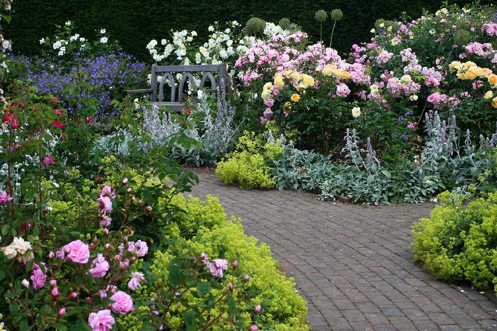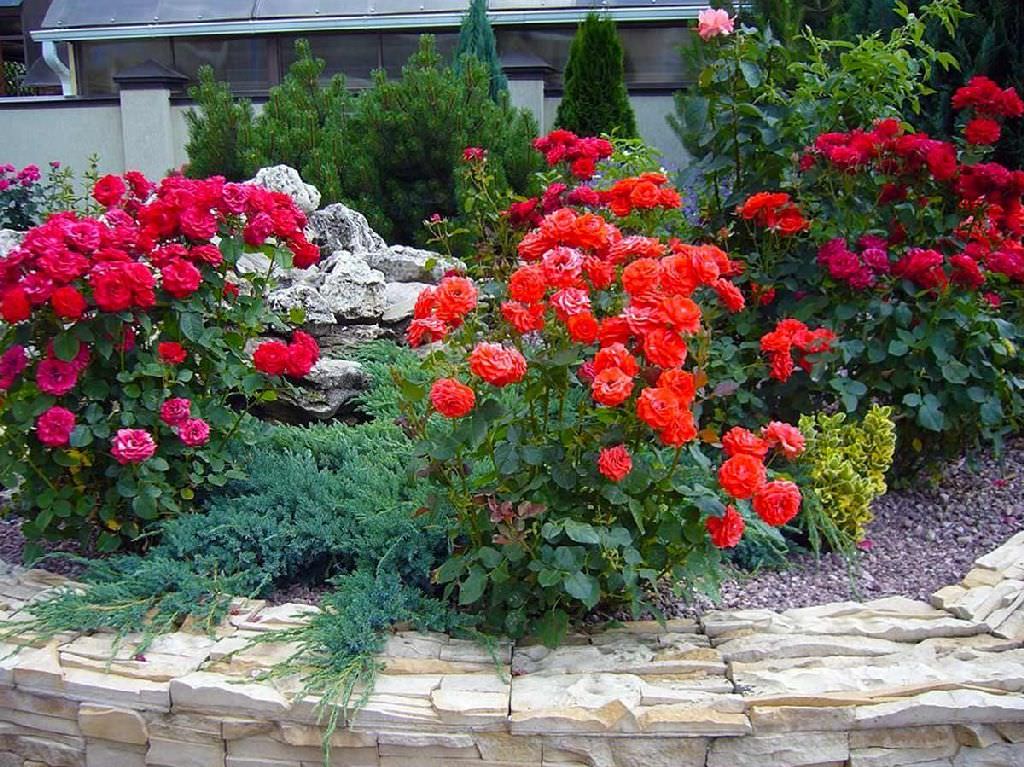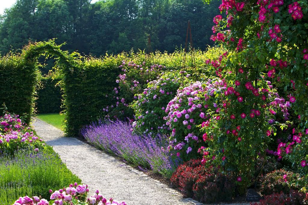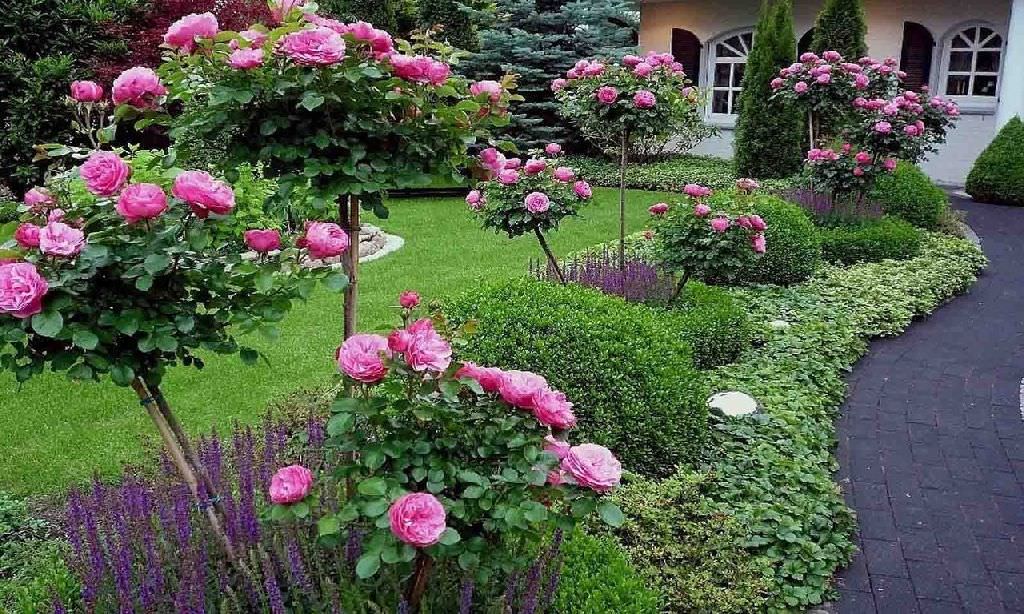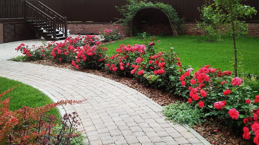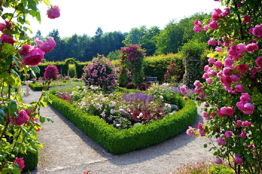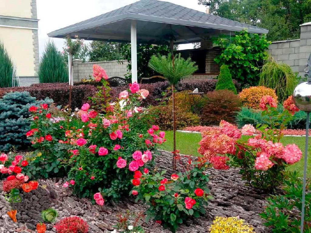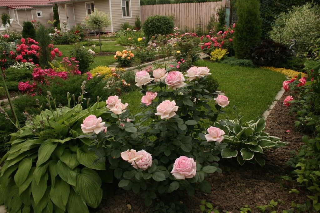 Розарий может быть не только самостоятельной зоной, но и частью общего ландшафтного дизайна. Хорошо смотрятся розы в сочетании с другими декоративными растениями: