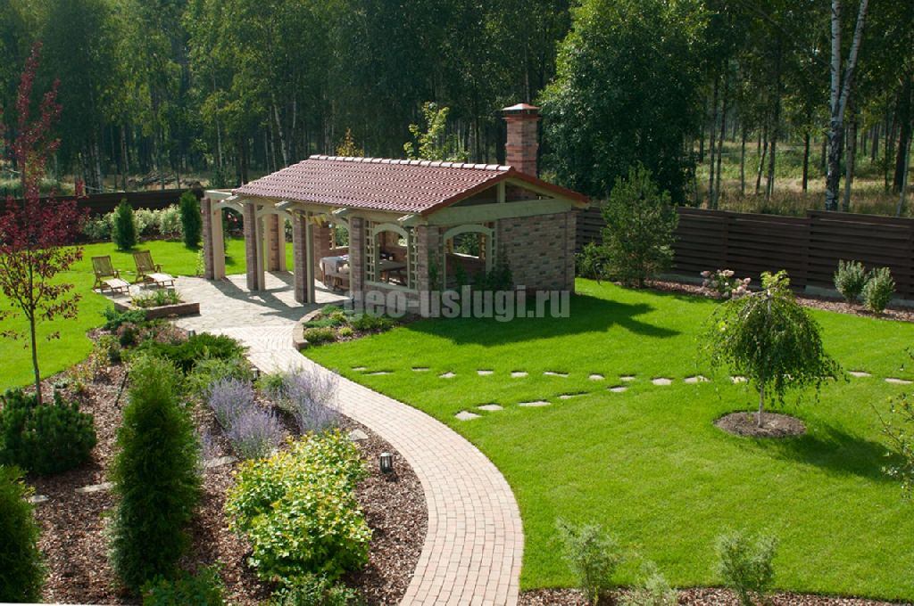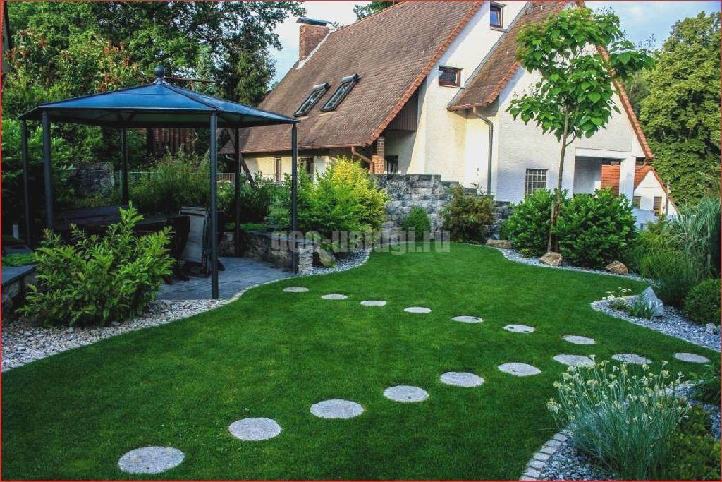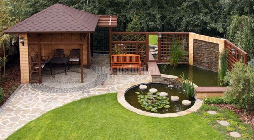 При планировке ландшафтного дизайна важно правильно разместить основные объекты, такие как дом, хозпостройки, беседки и водоемы. В квадратной планировке стоит уделить внимание центральной части участка. Например: