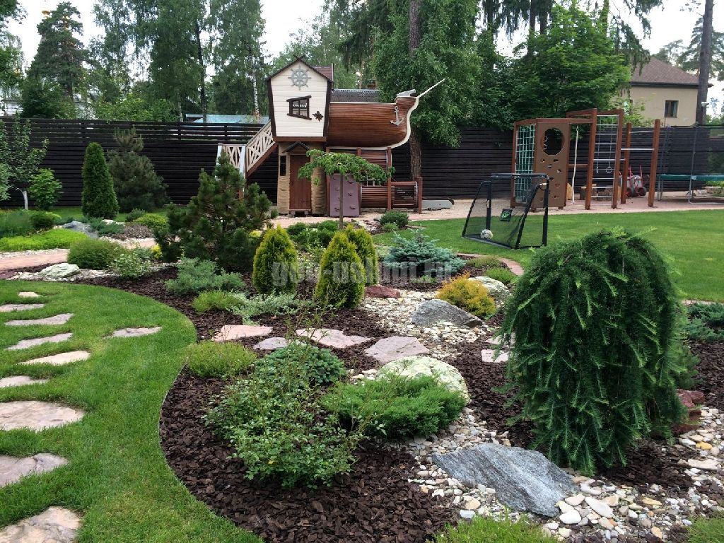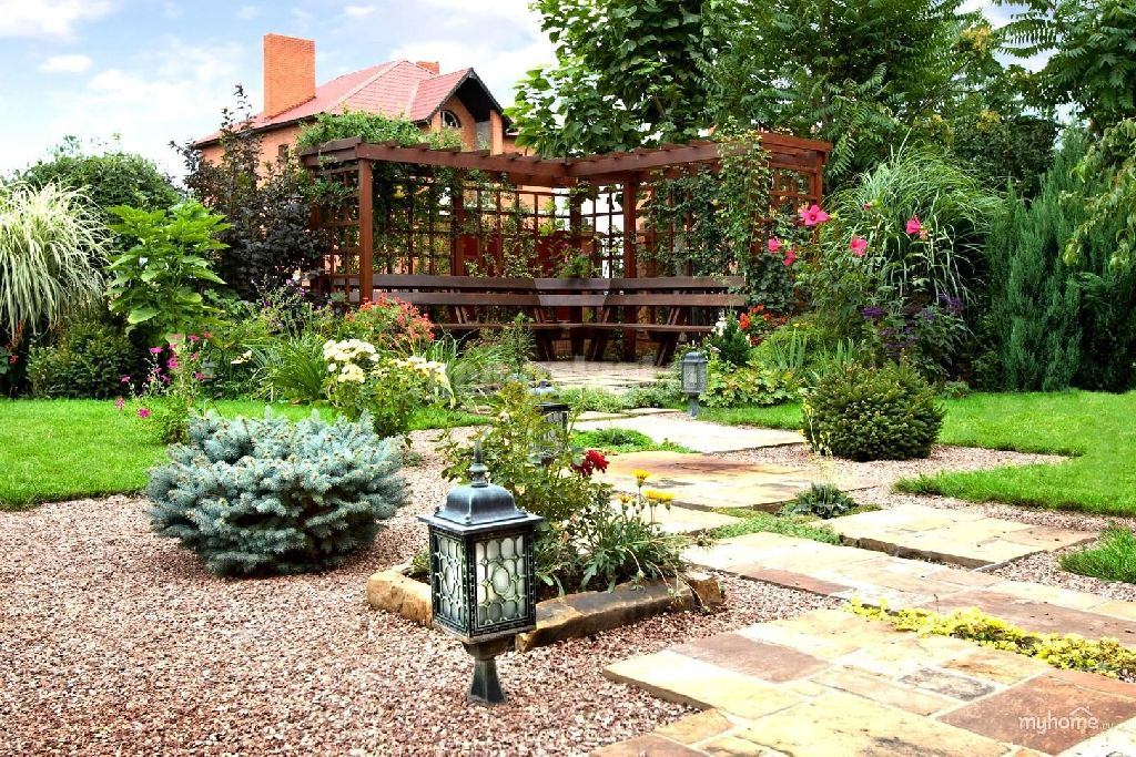 Если вам по душе естественность и натуральные материалы, природный стиль – идеальное решение. Для квадратного участка подойдут:
